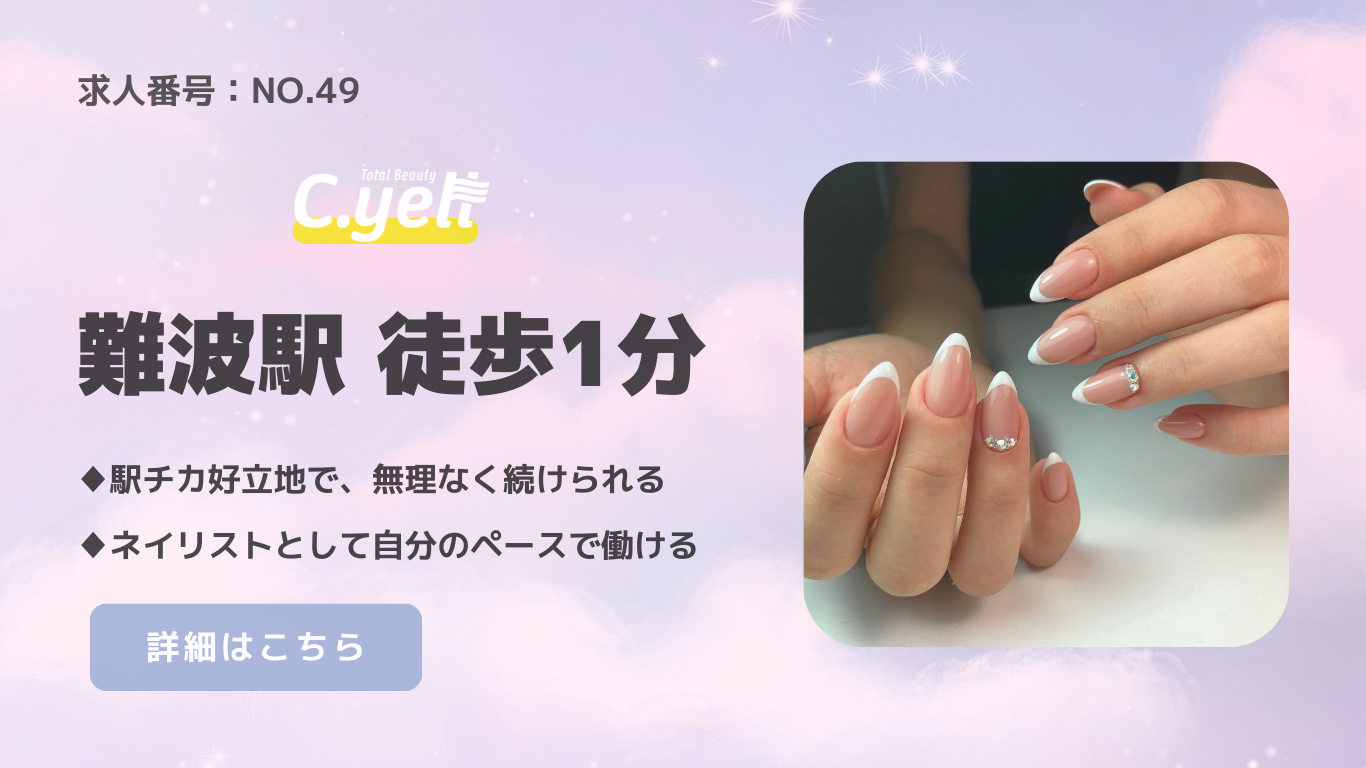 ネイリスト 大阪府正社員 【No.49】駅チカ×好立地!難波のネイル&まつげサロン💖|難波駅徒歩1分 未経験OK/難波/駅チカ/研修あり/社会保険完備 勤務時間✦10時から21時で8時間労働のシフト(1時間休憩) ✦残業10時間未満休日・休暇✦不定休給与✦基本給19万円福利厚生✦社会保険完備 ✦交通費支給:2万円までその他✦未経験OK! ✦年齢不問 LINEで問い合わせる 一覧に戻る HOME求人検索ネイリスト【No.49】駅チカ×好立地!難波のネイル&まつげサロン💖|難波駅徒歩1分